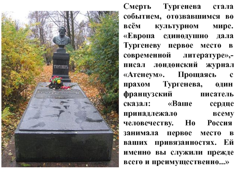 дала Тургеневу первое место в современной литературе»,- писал лондонский журнал «Атенеум». Прощаясь с прахом Тургенева, один французский писатель сказал: «Ваше сердце принадлежало всему человечеству. Но Россия занимала первое место в ваших привязанностях. Ей именно вы служили прежде всего и преимущественно...»
