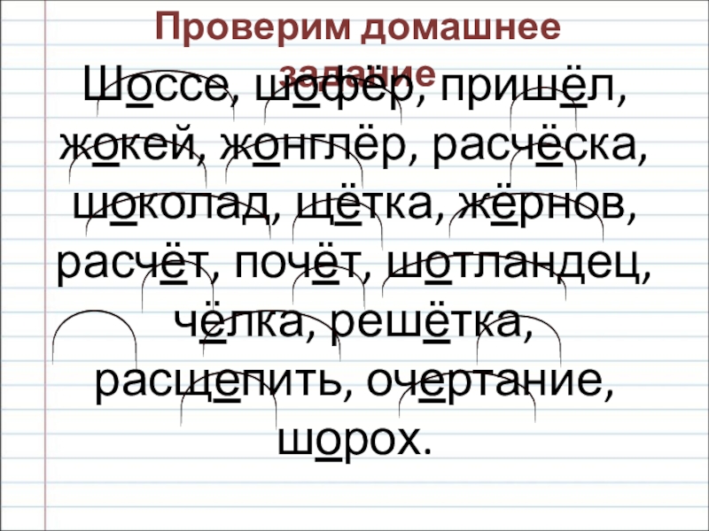 Проверим домашнее заданиеШоссе, шофёр, пришёл, жокей, жонглёр, расчёска, шоколад, щётка, жёрнов, расчёт, почёт, шотландец, чёлка, решётка, расщепить,