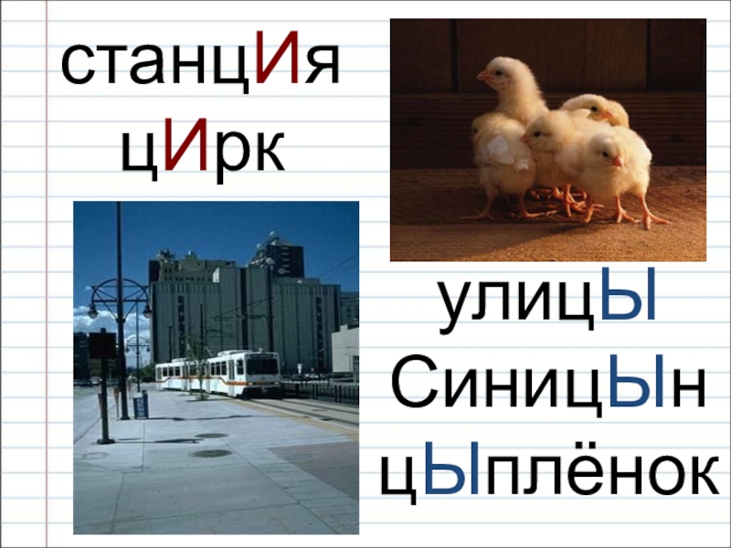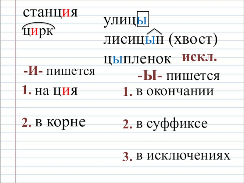 станцияциркулицылисицын (хвост)цыпленокискл.-И- пишется-Ы- пишется1. 2.1. 2.3.на цияв окончаниив суффиксев корнев исключениях