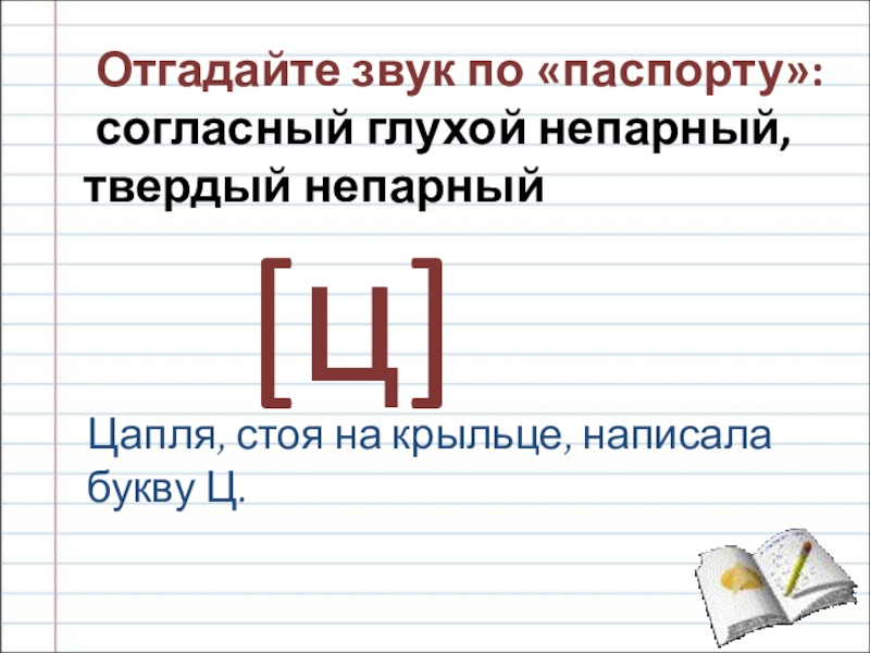 Отгадайте звук по «паспорту»:согласный глухой непарный, твердый непарный[ц]Цапля, стоя на крыльце, написала букву Ц.