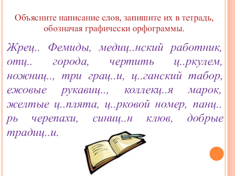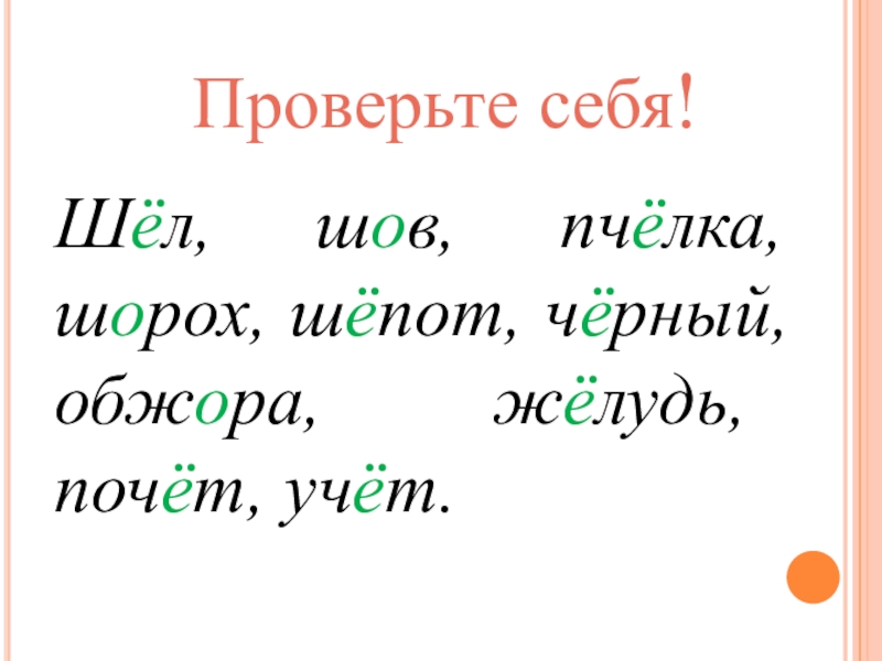Ш..л, ш..в, пч..лка, ш..рох, ш..пот, ч..рный, обж..ра, ж..лудь, поч..т, уч..т.