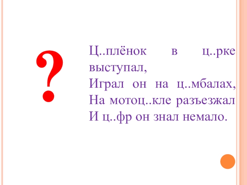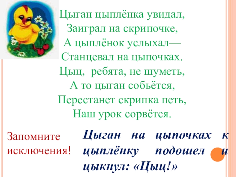 Цыган на цыпочках к цыплёнку подошел и цыкнул: «Цыц!»