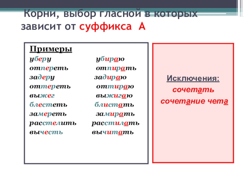 Корни, выбор гласной в которых зависит от суффикса А Примерыуберу