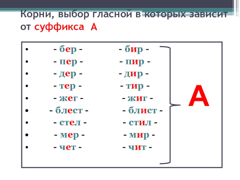 Слайд 4Корни, выбор гласной в которых зависит от суффикса А