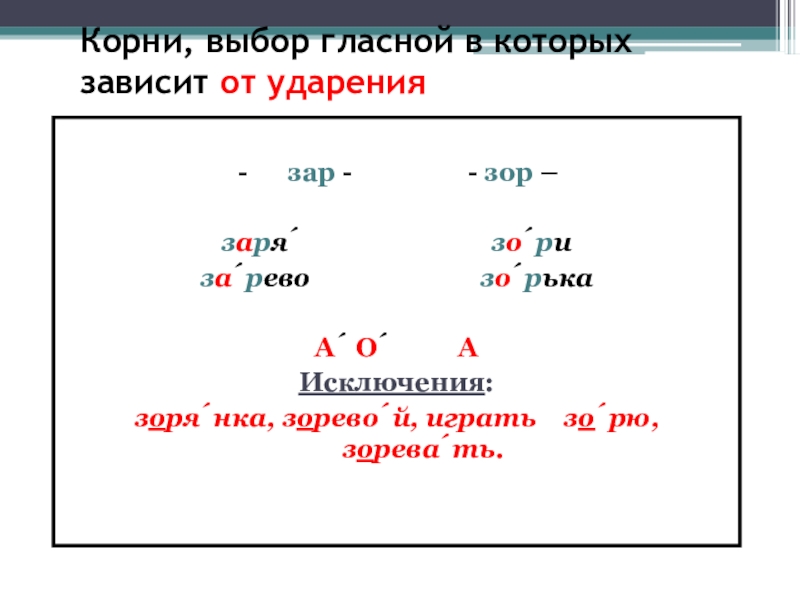 Слайд 6Корни, выбор гласной в которых зависит от ударения