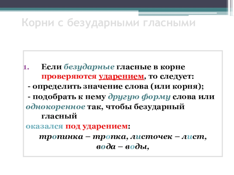 Корни с безударными гласнымиЕсли безударные гласные в корне проверяются ударением, то следует: - определить значение слова (или корня); - подобрать к нему другую форму слова илиоднокоренное так, чтобы безударный гласныйоказался под ударением:тропинка – тропка, листочек –