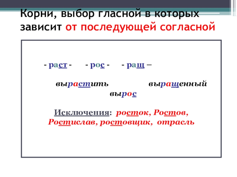 Слайд 9Корни, выбор гласной в которых зависит от последующей согласной