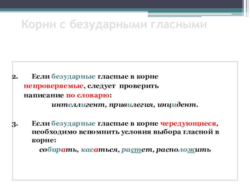 Корни с безударными гласнымиЕсли безударные гласные в корне   непроверяемые, следует проверить   написание по