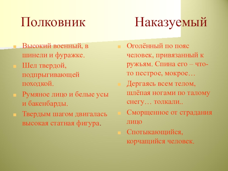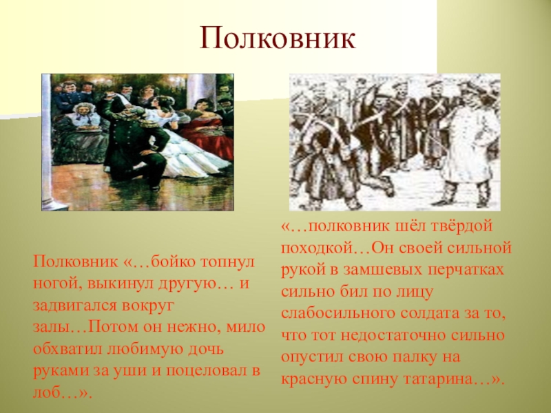 «…полковник шёл твёрдой походкой…Он своей сильной рукой в замшевых перчатках сильно бил по лицу слабосильного солдата за то, что тот недостаточно сильно опустил свою палку на красную спину татарина…».