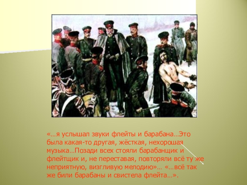 «…я услышал звуки флейты и барабана…Это была какая-то другая, жёсткая, нехорошая музыка…Позади всех стояли барабанщик и флейтщик и, не переставая, повторяли всё ту же неприятную, визгливую мелодию»… «…всё так же били барабаны и свистела флейта…».