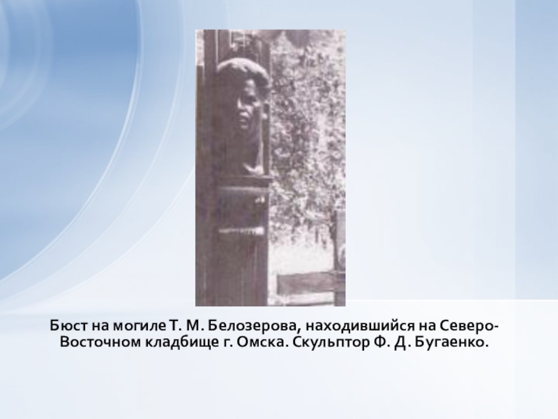 Слайд 13Бюст на могиле Т. М. Белозерова, находившийся на Северо-Восточном кладбище г.