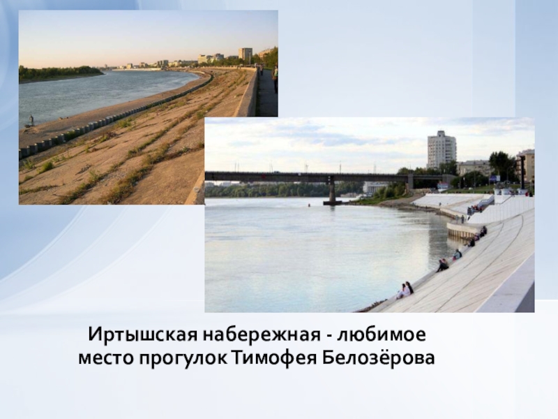 Слайд 5Иртышская набережная - любимое место прогулок Тимофея Белозёрова