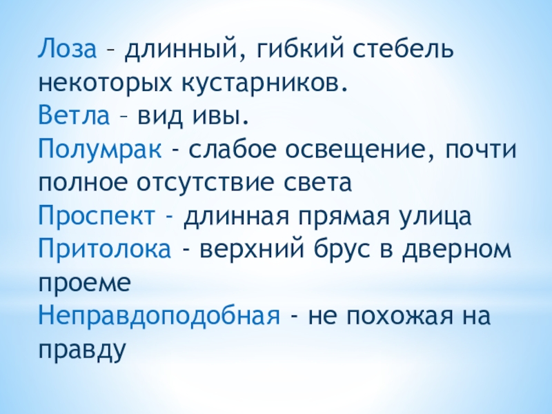 Лоза – длинный, гибкий стебель некоторых кустарников.Ветла – вид ивы.Полумрак - слабое освещение, почти полное отсутствие светаПроспект