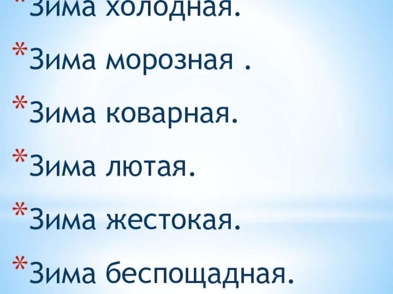 Зима холодная.Зима морозная .Зима коварная.Зима лютая.Зима жестокая.Зима беспощадная.