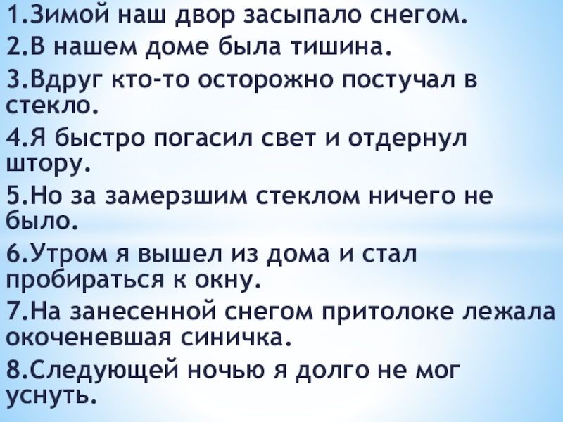1.Зимой наш двор засыпало снегом.2.В нашем доме была тишина.3.Вдруг кто-то осторожно постучал в стекло.4.Я быстро погасил свет