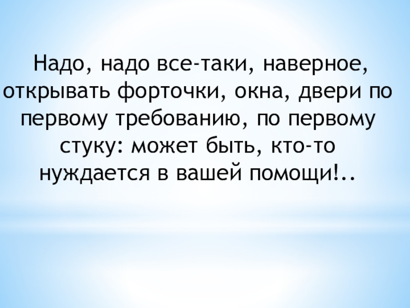 Надо, надо все-таки, наверное, открывать форточки, окна, двери по первому требованию, по первому стуку: может быть,