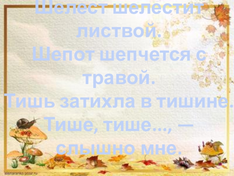 Слайд 13Шелест шелестит листвой. Шепот шепчется с травой. Тишь затихла в тишине.