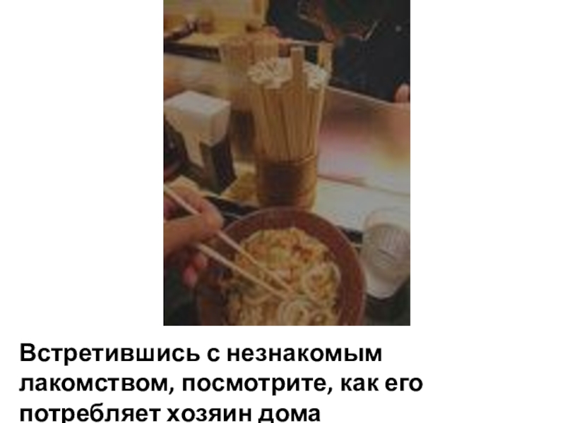 Слайд 5Встретившись с незнакомым лакомством, посмотрите, как его потребляет хозяин дома