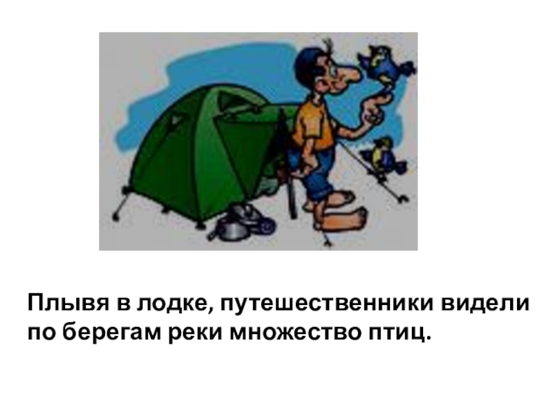 Слайд 10Плывя в лодке, путешественники видели по берегам реки множество птиц.