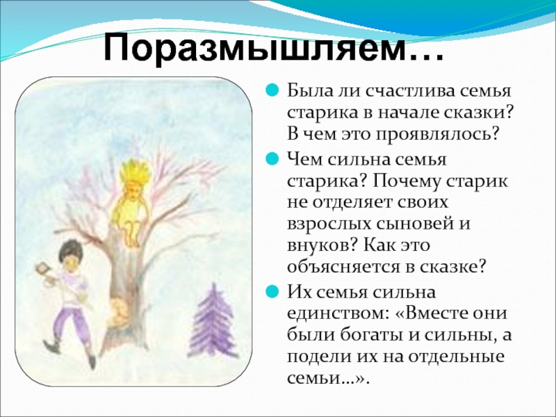 Чем сильна семья старика? Почему старик не отделяет своих взрослых сыновей и внуков? Как это объясняется в сказке?