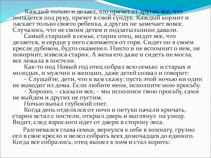 Самый старший в семье, старик отец, видит все, что делается, и сердце у него сжимается от горя. Сидит он в своем кресле дубовом, будто окаменел. Никто и не вспомнит о нем, не покормит, извелся старик. А жена его даже и сидеть не могла, все лежала в постели.