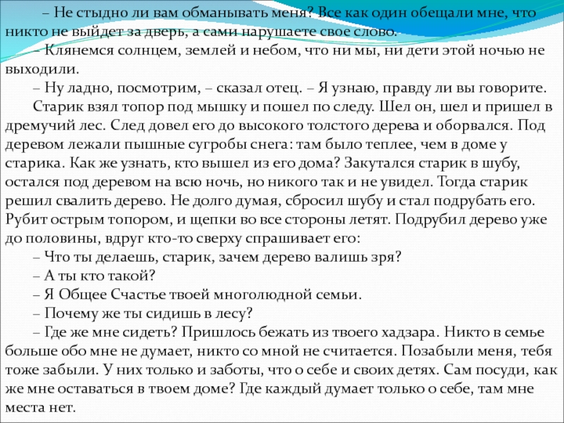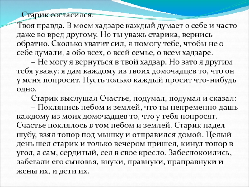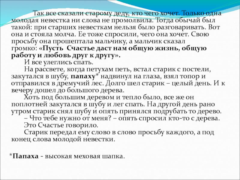 – Поклянись небом и землей, что ты непременно дашь каждому из моих домочадцев то, что у тебя попросят. Счастье поклялось в том небом и землей. Старик надел шубу, взял топор под мышку и отправился домой. Целый день шел старик и только вечером пришел, кинул топор в угол, а сам, сердитый, сел в свое кресло. Забеспокоились, забегали его сыновья, внуки, правнуки, праправнуки и жены их, и дети их.