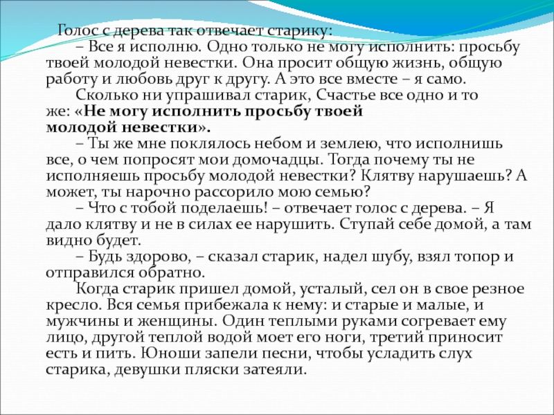 Старик передал ему слово в слово просьбу каждого, а под конец слова молодой невестки.