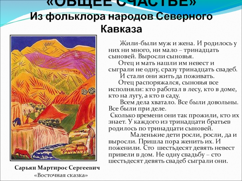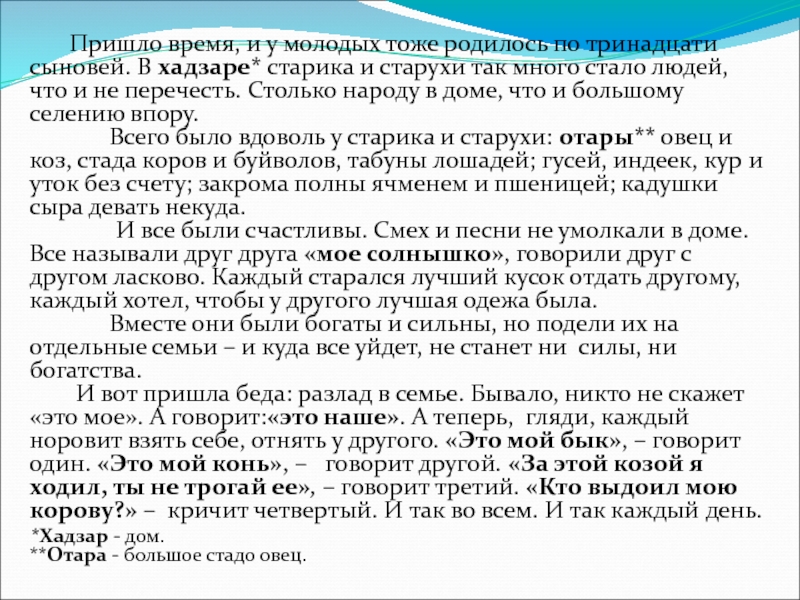 Слайд 4 Пришло время, и у молодых тоже родилось по тринадцати сыновей. В хадзаре* старика и