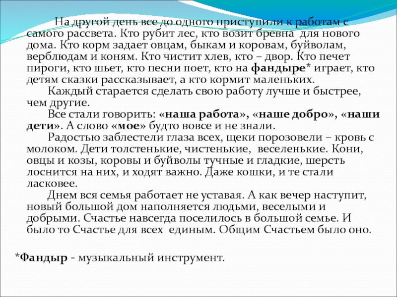Днем вся семья работает не уставая. А как вечер наступит, новый большой дом наполняется людьми, веселыми и добрыми. Счастье навсегда поселилось в большой семье. И было то Счастье для всех единым. Общим Счастьем было оно.
