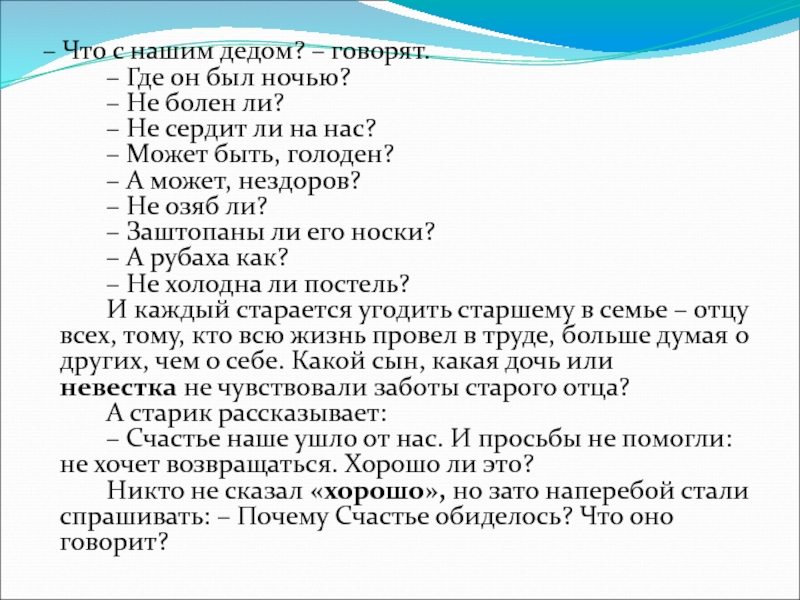 Все молча слушали слова старика. И каждый думал про себя: «Правду говорит Счастье».