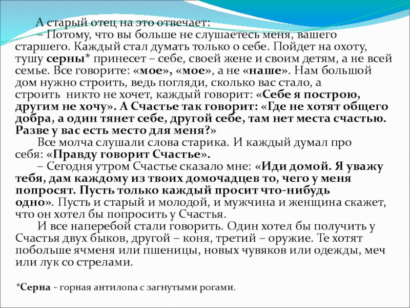 слушаетесь меня, вашего старшего. Каждый стал думать только о себе. Пойдет на охоту, тушу серны* принесет – себе, своей жене и своим детям, а не всей семье. Все говорите: «мое», «мое», а не «наше». Нам большой дом нужно строить, ведь погляди, сколько вас стало, а строить никто не хочет, каждый говорит: «Себе я построю, другим не хочу». А Счастье так говорит: «Где не хотят общего добра, а один тянет себе, другой себе, там нет места счастью. Разве у вас есть место для меня?»