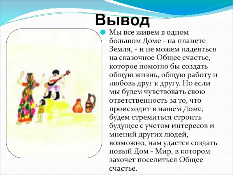 - и не можем надеяться на сказочное Общее счастье, которое помогло бы создать общую жизнь, общую работу и любовь друг к другу. Но если мы будем чувствовать свою ответственность за то, что происходит в нашем Доме, будем стремиться строить будущее с учетом интересов и мнений других людей, возможно, нам удастся создать новый Дом - Мир, в котором захочет поселиться Общее счастье.