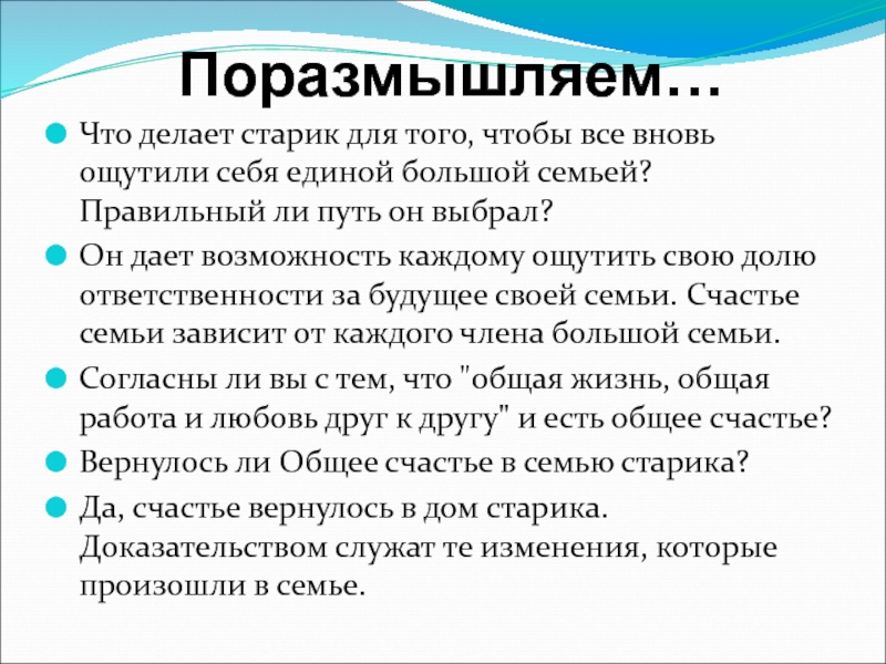 Он дает возможность каждому ощутить свою долю ответственности за будущее своей семьи. Счастье семьи зависит от каждого члена большой семьи.