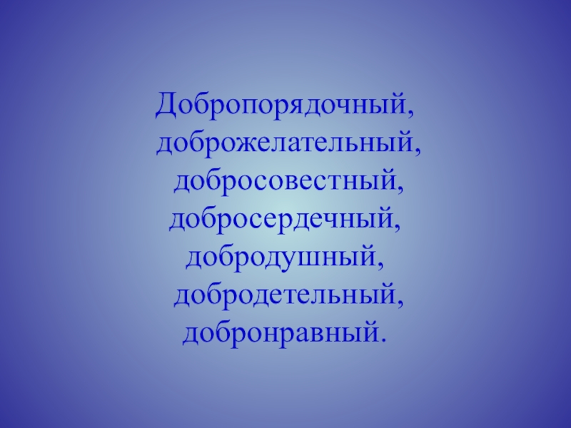 Добропорядочный, доброжелательный, добросовестный, добросердечный, добродушный, добродетельный, добронравный.