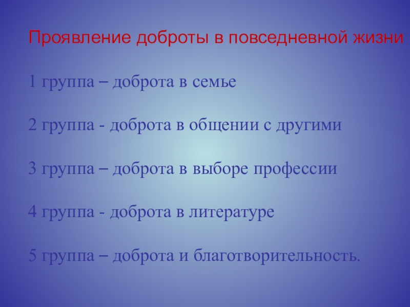 Проявление доброты в повседневной жизни1 группа – доброта в семье2 группа - доброта в общении с другими3