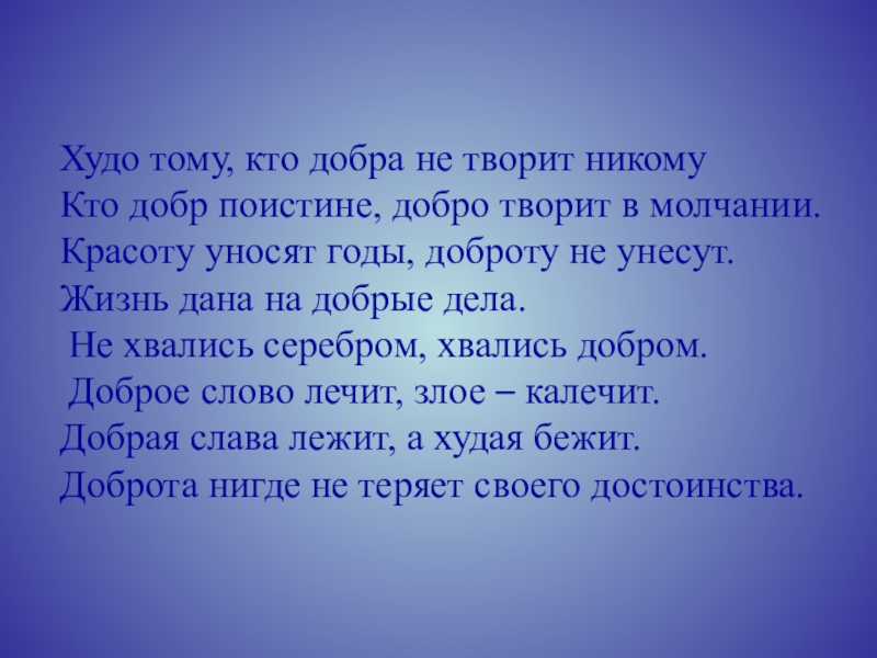 Худо тому, кто добра не творит никому Кто добр поистине, добро творит в молчании. Красоту уносят годы, доброту