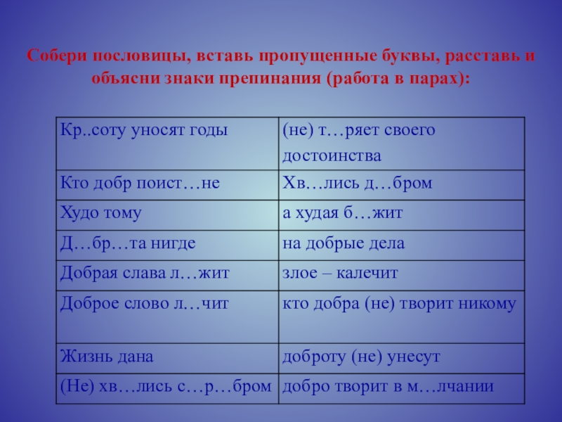 Слайд 4Собери пословицы, вставь пропущенные буквы, расставь и объясни знаки препинания (работа