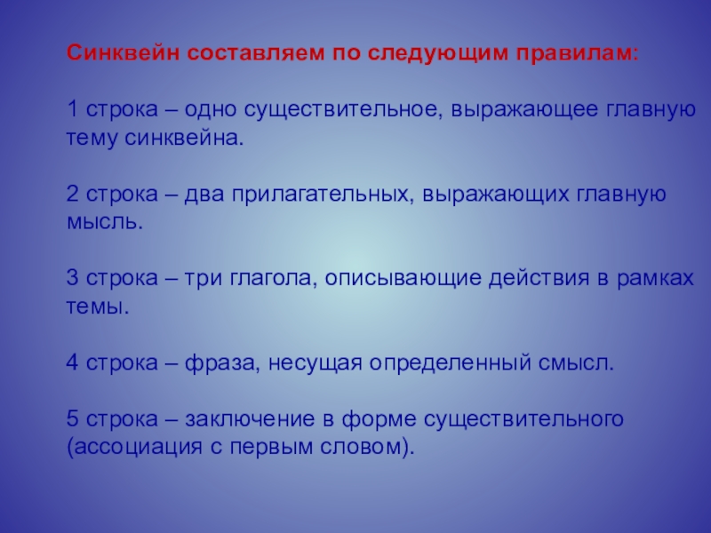 Синквейн составляем по следующим правилам:1 строка – одно существительное, выражающее главную тему cинквейна.2 строка – два прилагательных, выражающих