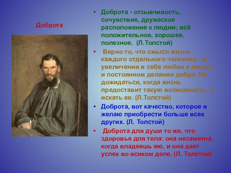 ДобротаДоброта - отзывчивость, сочувствие, дружеское расположение к людям; всё положительное, хорошее, полезное. (Л.Толстой) Верно то, что смысл жизни