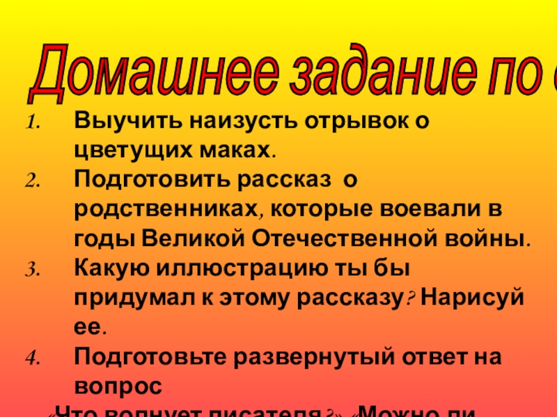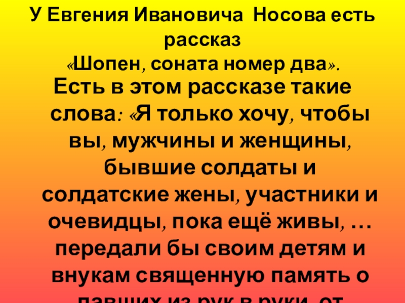 этом рассказе такие слова: «Я только хочу, чтобы вы, мужчины и женщины, бывшие солдаты и солдатские жены, участники и очевидцы, пока ещё живы, … передали бы своим детям и внукам священную память о павших из рук в руки, от сердца к сердцу».