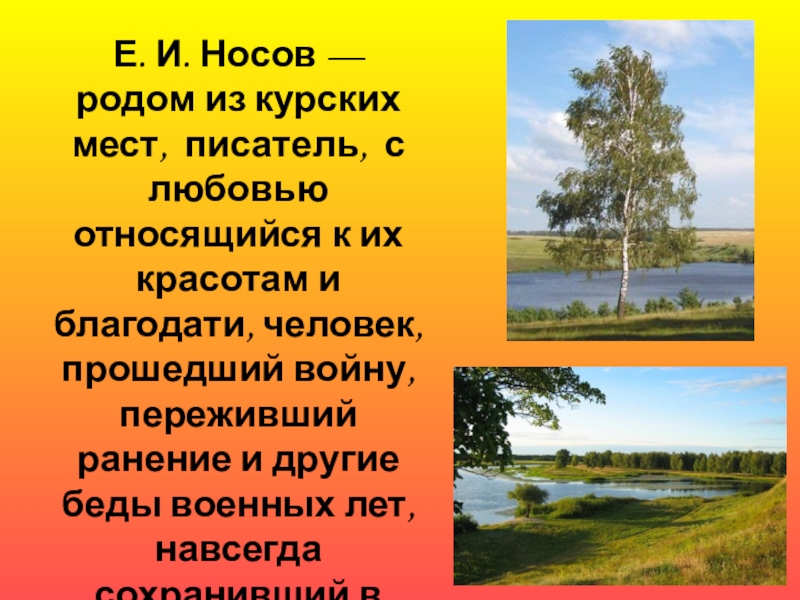 Слайд 8 Е. И. Носов — родом из курских мест, писатель,