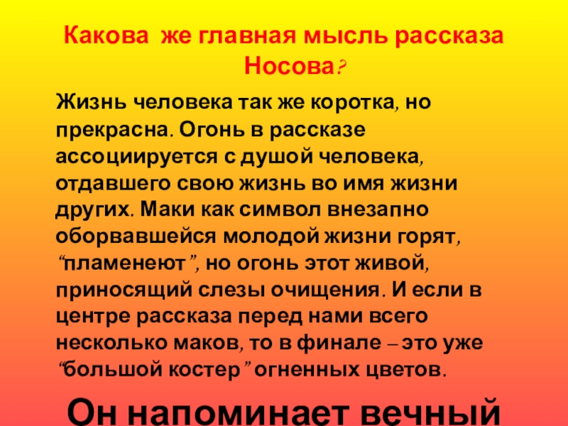 коротка, но прекрасна. Огонь в рассказе ассоциируется с душой человека, отдавшего свою жизнь во имя жизни других. Маки как символ внезапно оборвавшейся молодой жизни горят, “пламенеют”, но огонь этот живой, приносящий слезы очищения. И если в центре рассказа перед нами всего несколько маков, то в финале – это уже “большой костер” огненных цветов.