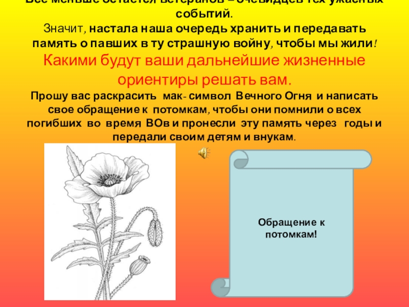Прошу вас раскрасить мак- символ Вечного Огня и написать свое обращение к потомкам, чтобы они помнили о всех погибших во время ВОв и пронесли эту память через годы и передали своим детям и внукам.