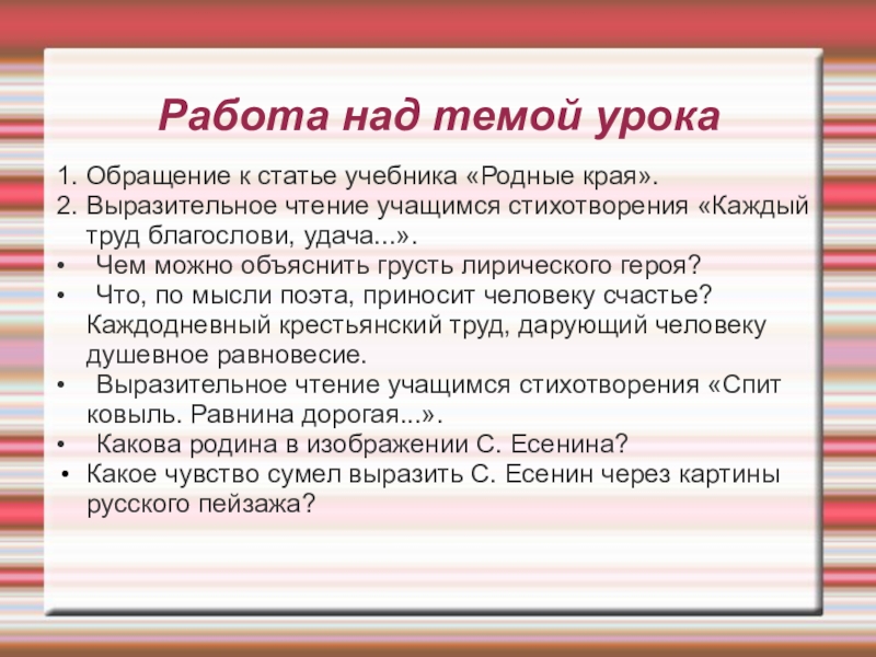 • Что, по мысли поэта, приносит человеку счастье? Каждодневный крестьянский труд, дарующий человеку душевное равновесие.