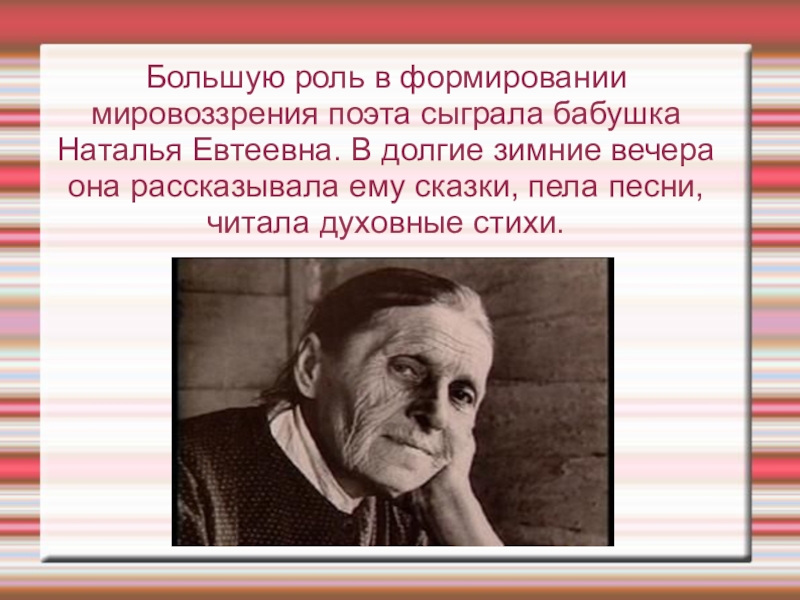 Слайд 8Большую роль в формировании мировоззрения поэта сыграла бабушка Наталья Евтеевна. В