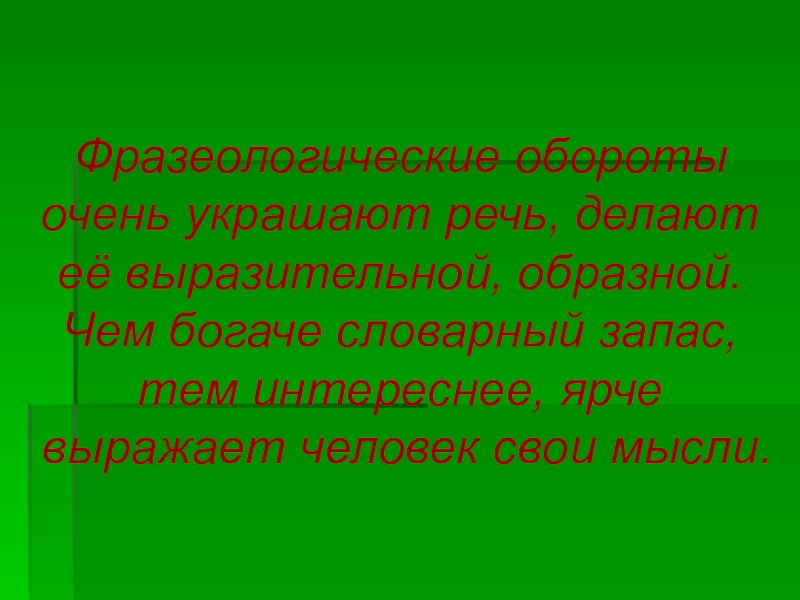 Фразеологические обороты очень украшают речь, делают её выразительной, образной. Чем богаче словарный запас, тем интереснее, ярче выражает