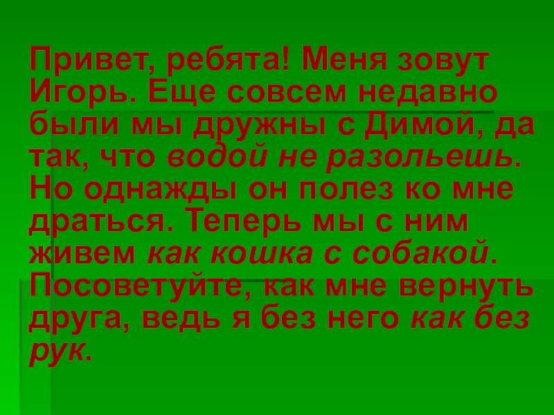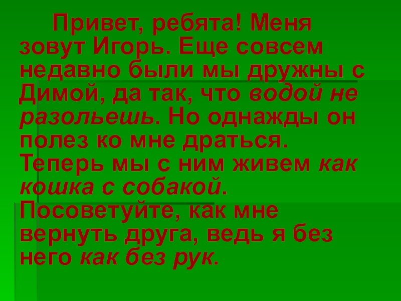 Привет, ребята! Меня зовут Игорь. Еще совсем недавно были мы дружны с Димой, да так, что водой не разольешь. Но однажды он полез ко мне драться.