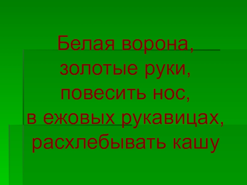 Белая ворона, золотые руки, повесить нос, в ежовых рукавицах, расхлебывать кашу