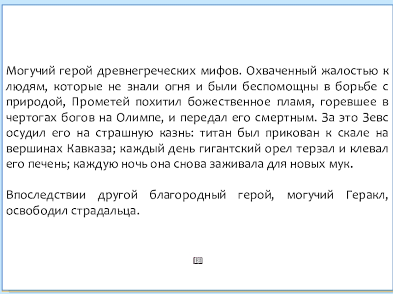 Могучий герой древнегреческих мифов. Охваченный жалостью к людям, которые не знали огня и были беспомощны в борьбе с природой, Прометей похитил божественное пламя, горевшее в чертогах богов на Олимпе, и передал его смертным. За это Зевс осудил его на страшную казнь: титан был прикован к скале на вершинах Кавказа; каждый день гигантский орел терзал и клевал его печень; каждую ночь она снова заживала для новых мук.