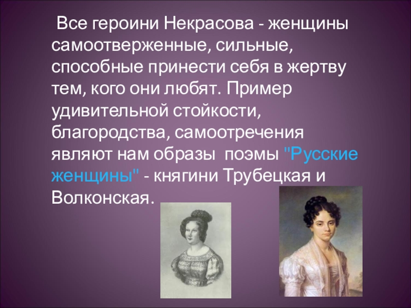 жертву тем, кого они любят. Пример удивительной стойкости, благородства, самоотречения являют нам образы поэмы "Русские женщины" - княгини Трубецкая и Волконская.